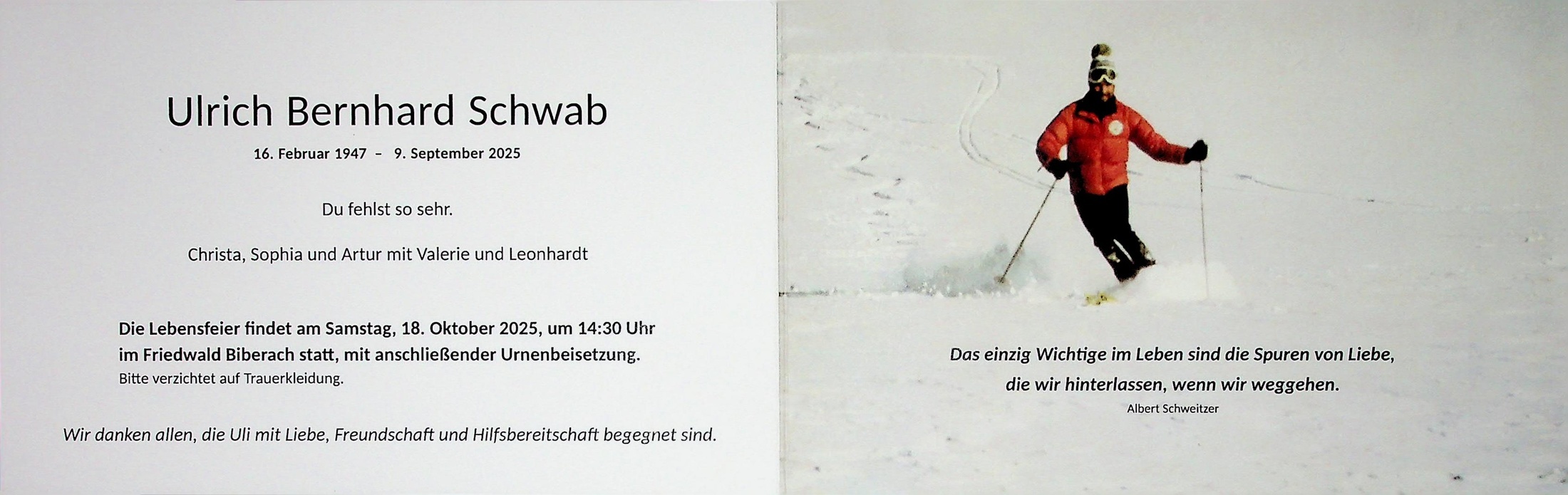 Am 09. September 2025 ist unser Skikamerad und Freund Uli Schwab verstorben. Nachfolgend findet Ihr einen Nachruf.